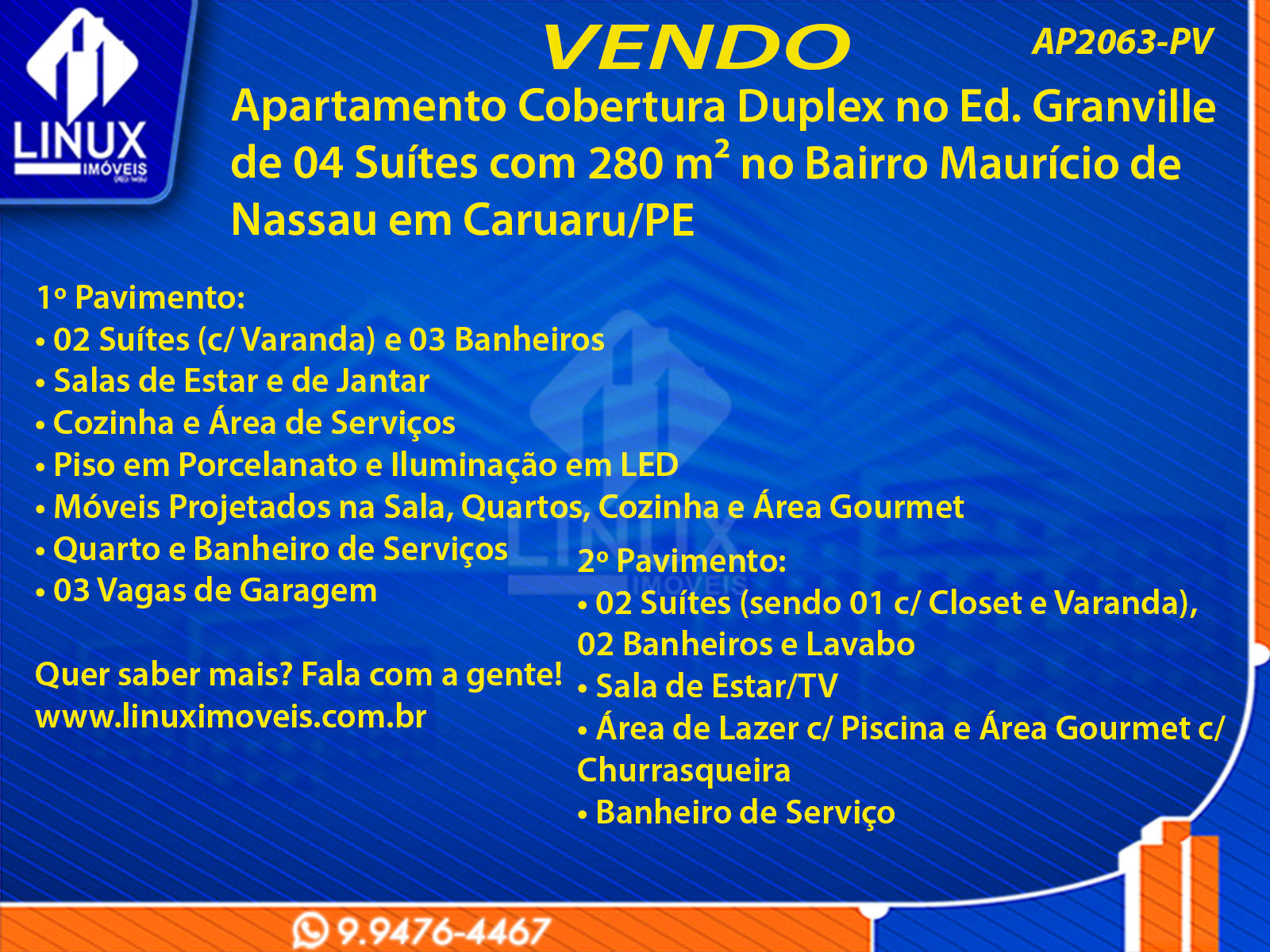 R$1.500.000,00 / VENDAApartamento Cobertura Duplex no Ed. Granville em Caruaru/PE à Venda (AP2063-PV)