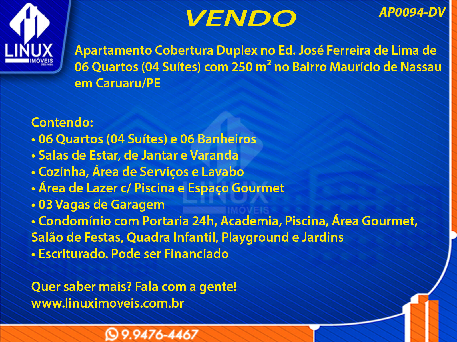 R$1.700.000,00 / VENDAApartamento Cobertura Duplex no Ed. José Ferreira de Lima em Caruaru/PE à Venda (AP0094-DV)