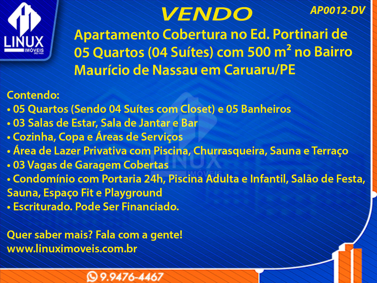 R$1.500.000,00 / VENDAApartamento Cobertura no Ed. Portinari em Caruaru/PE à Venda (AP0012-DV)