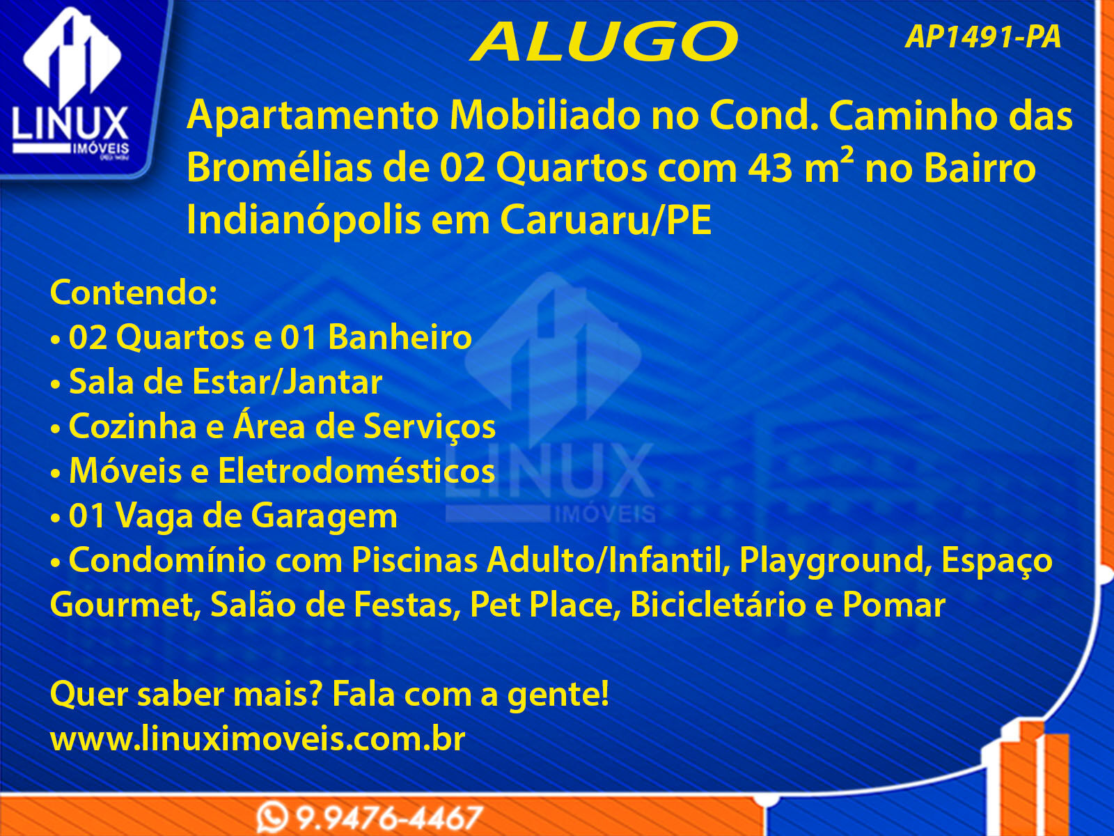 R$1.665,00 / ALUGUELApartamento Mobiliado no Cond. Caminho das Bromélias em Caruaru/PE p/ Locação (AP1491-PA)