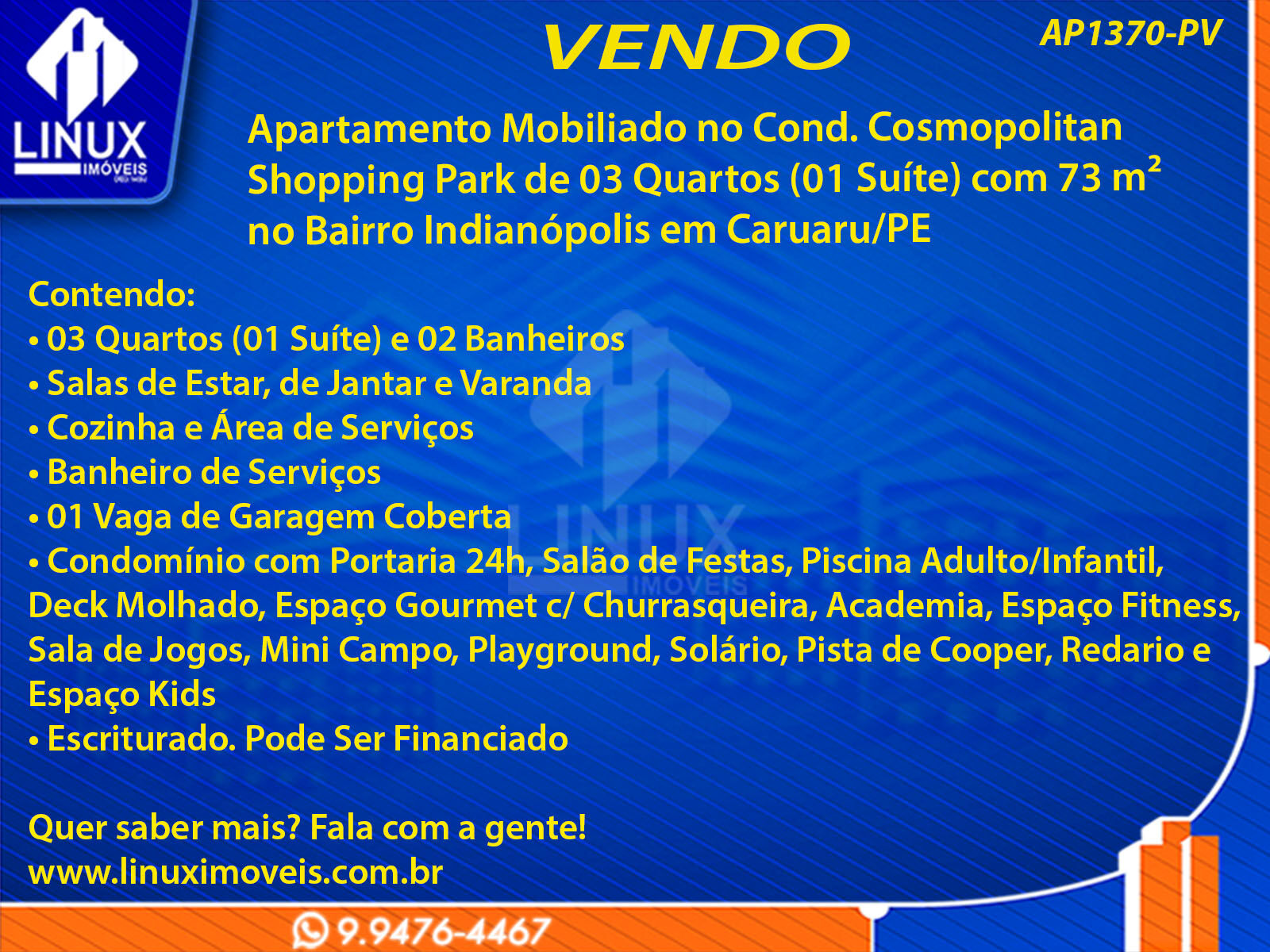 R$780.000,00 / VENDAApartamento Mobiliado no Cond. Cosmopolitan Shopping Park em Caruaru/PE à Venda (AP1370-PV)