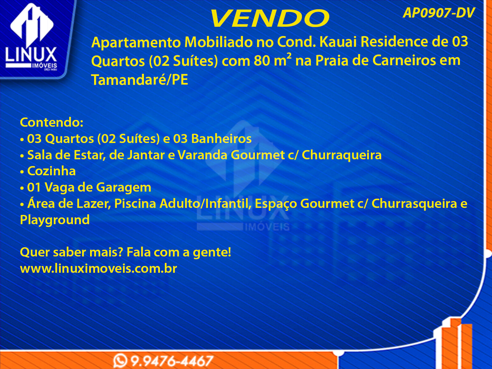 Apartamento Mobiliado no Cond. Kauai Residence de 03 Quartos (02 Suítes) com 80 m² na Praia dos Carneiros em Tamandaré/PE