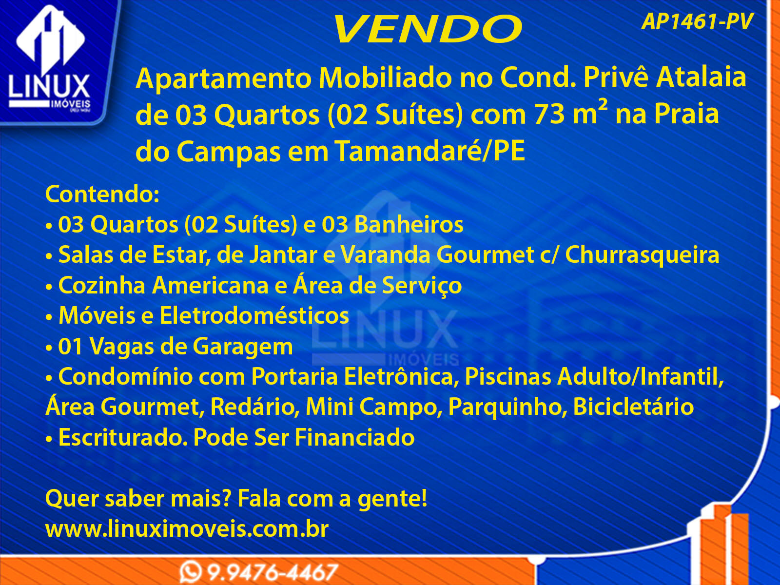 Apartamento Mobiliado no Cond. Privê Atalaia de 03 Quartos (02 Suítes) com 73 m² na Praia do Campas em Tamandaré/PE