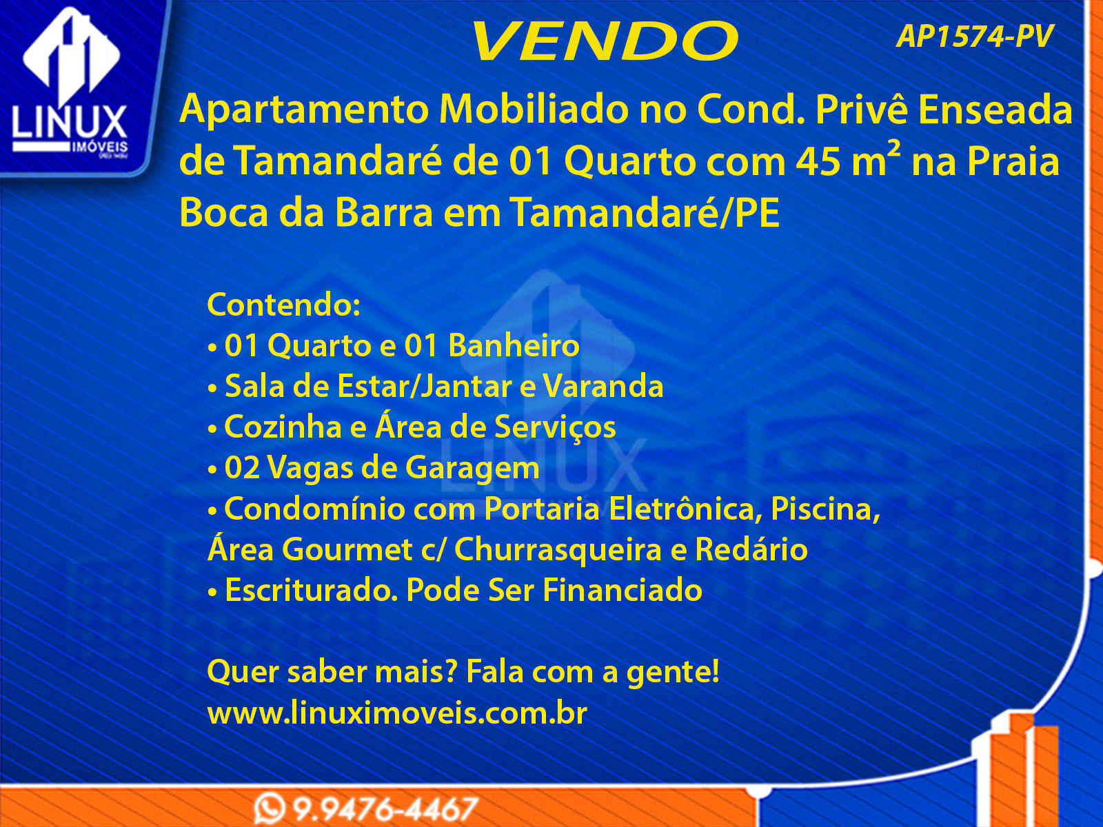 Apartamento Mobiliado no Cond. Privê Enseada de Tamandaré de 01 Quarto com 45 m² na Praia Boca da Barra em Tamandaré/PE