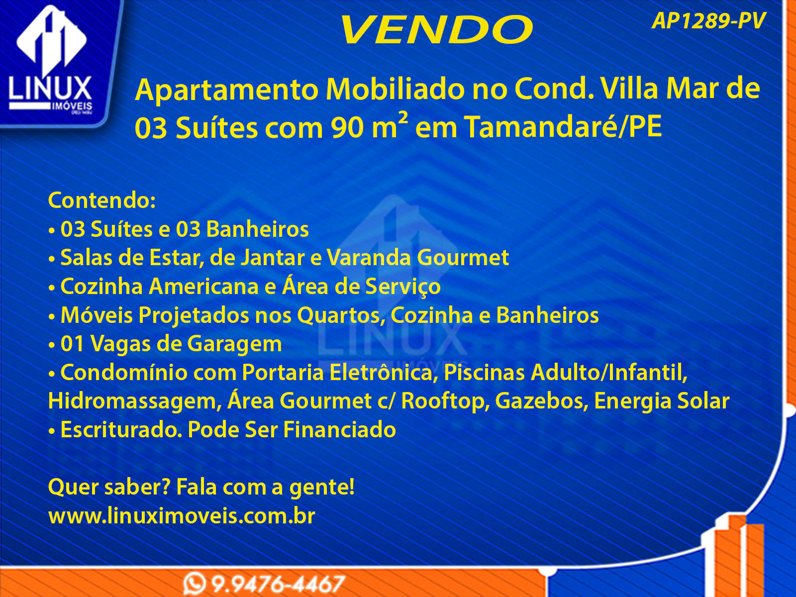 Apartamento Mobiliado no Cond. Villa Mar de 03 Suítes com 90 m² em Tamandaré/PE