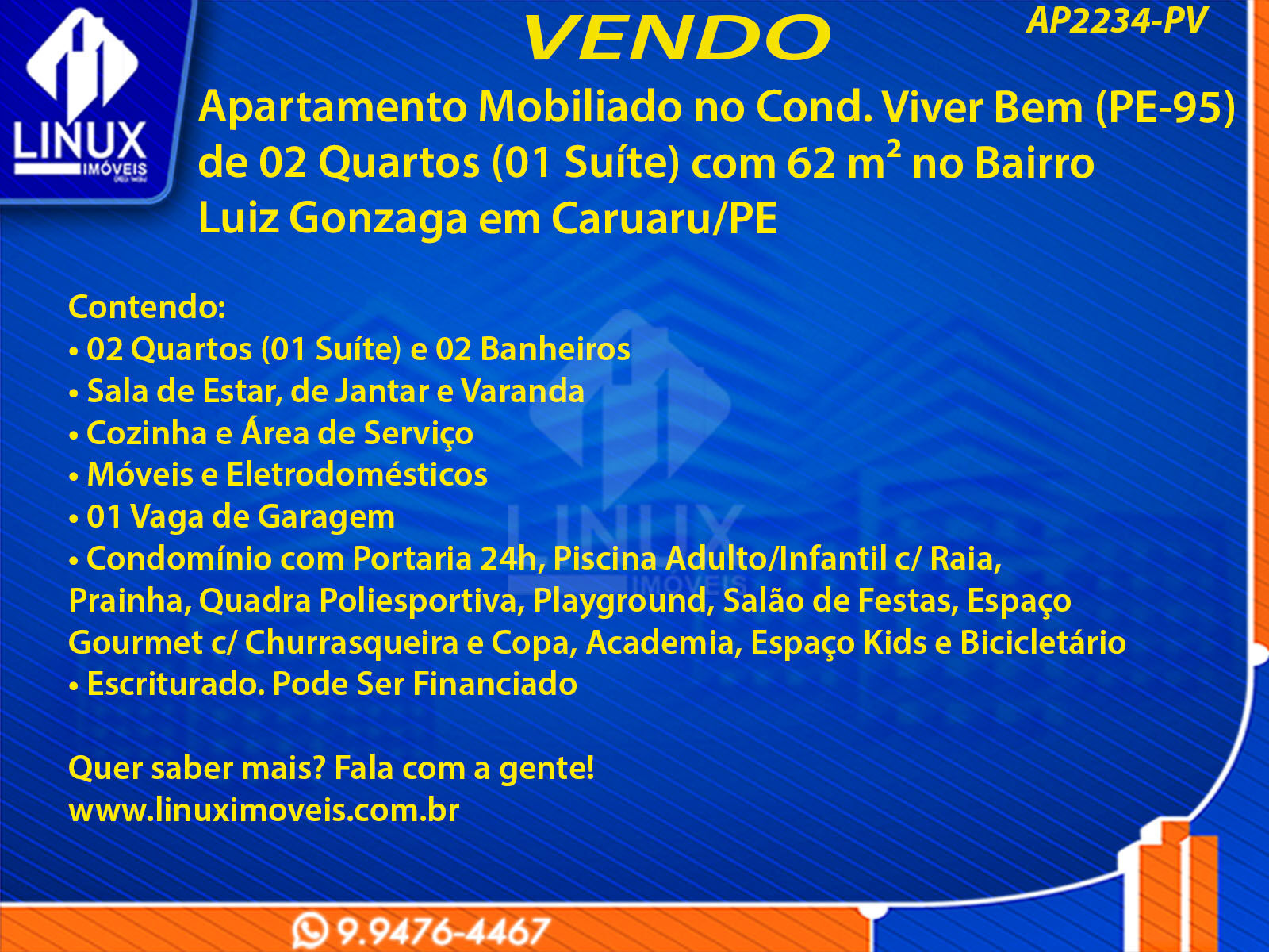 R$260.000,00 / VENDAApartamento Mobiliado no Cond. Viver Bem (PE-95) em Caruaru/PE à Venda (AP2234-PV)