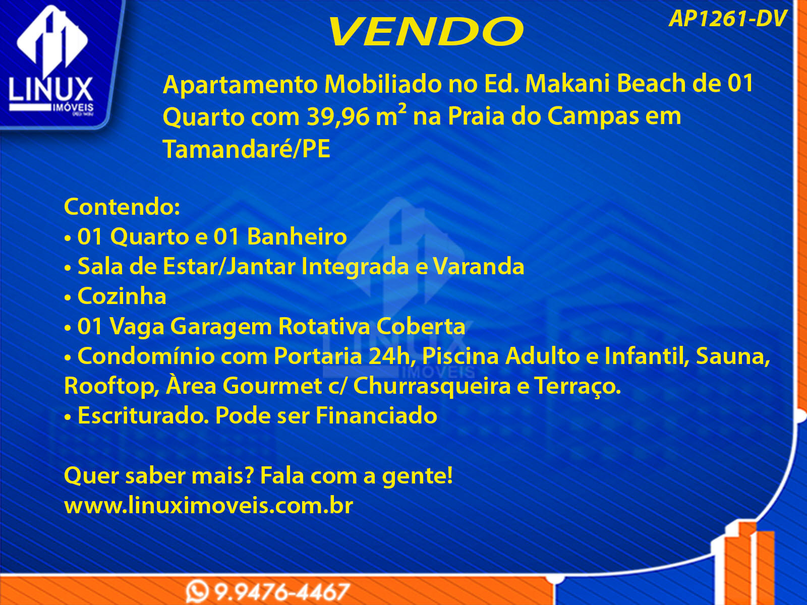R$480.000,00 / VENDAApartamento Mobiliado no Ed. Makani Beach à Venda (AP1261-DV)