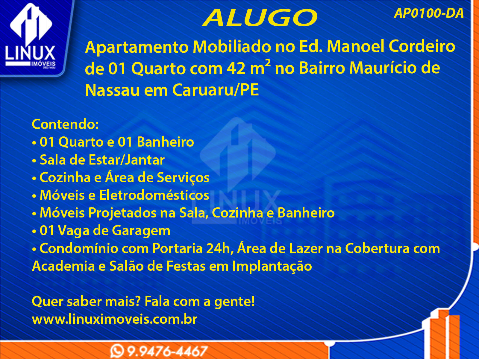 R$1.800,00 / ALUGUELApartamento Mobiliado no Ed. Manoel Cordeiro em Caruaru/PE p/ Locação (AP0100-DA)