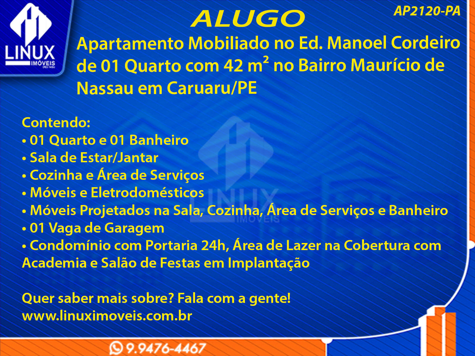R$2.250,00 / ALUGUELApartamento Mobiliado no Ed. Manoel Cordeiro em Caruaru/PE p/ Locação (AP2120-PA)