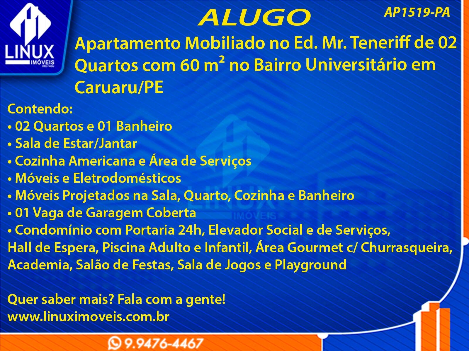 Apartamento Mobiliado no Ed. Mr. Teneriff em Caruaru/PE p/ Locação (AP1519-PA)
