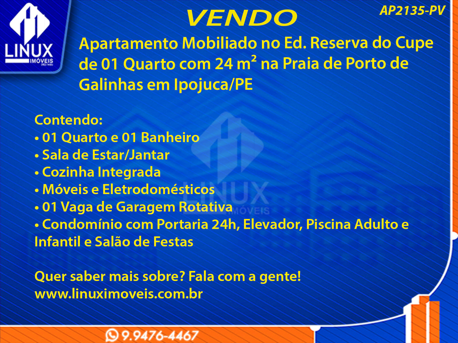 R$250.000,00 / VENDAApartamento Mobiliado no Ed. Reserva do Cupe à Venda (AP2135-PV)