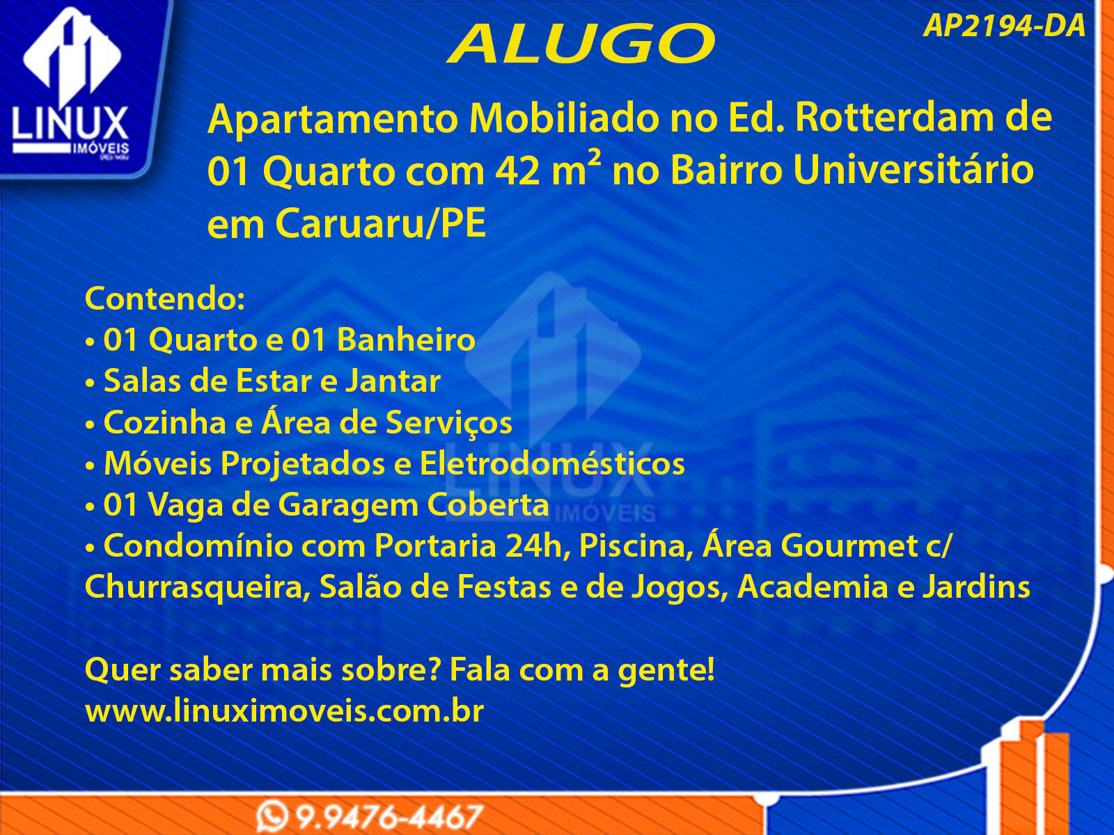 R$2.000,00 / ALUGUELApartamento Mobiliado no Ed. Rotterdam em Caruaru/PE p/ Locação (AP2194-DA)