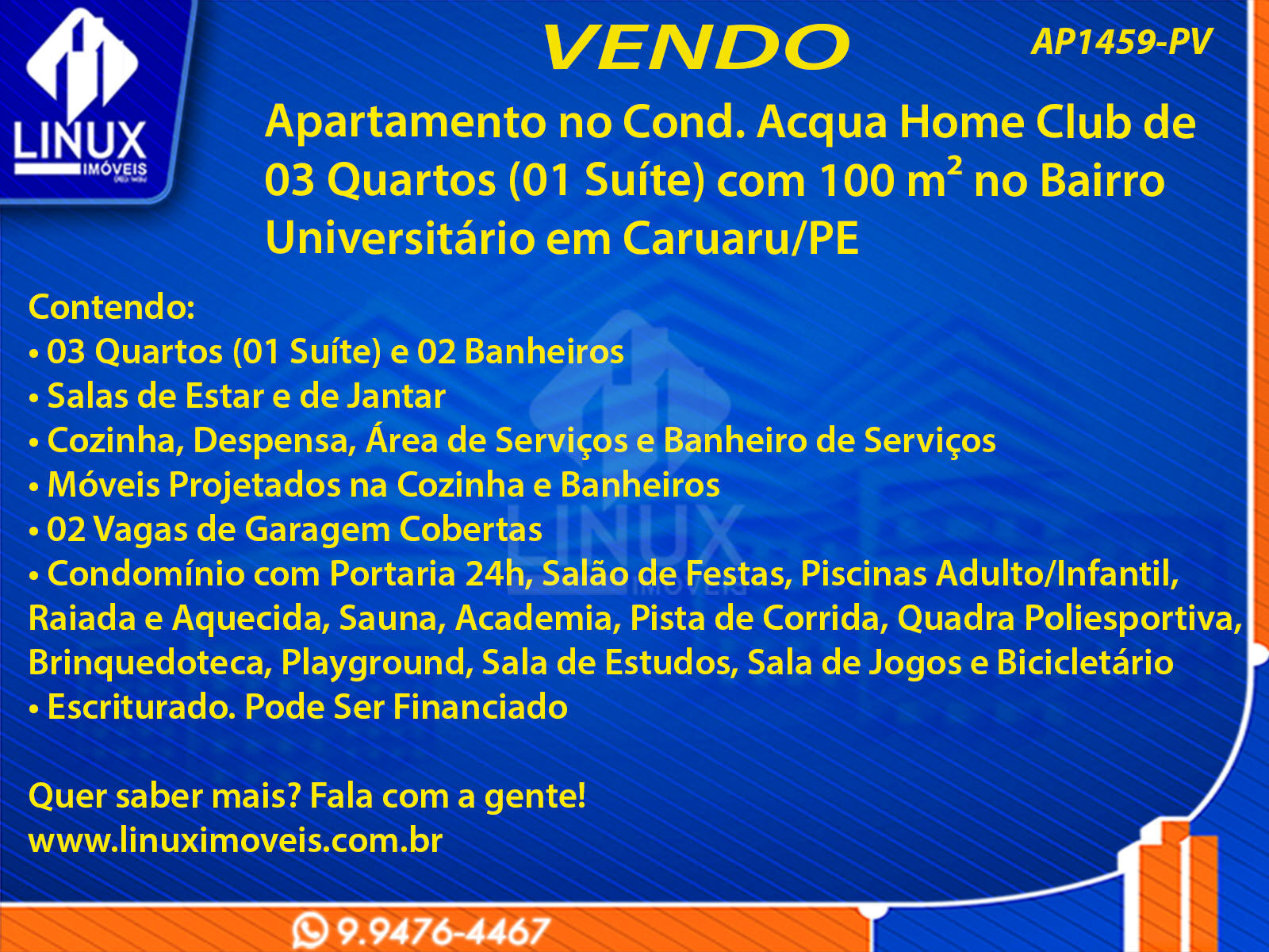 R$680.000,00 / VENDAApartamento no Cond. Acqua Home Club à Venda (AP1459-PV)