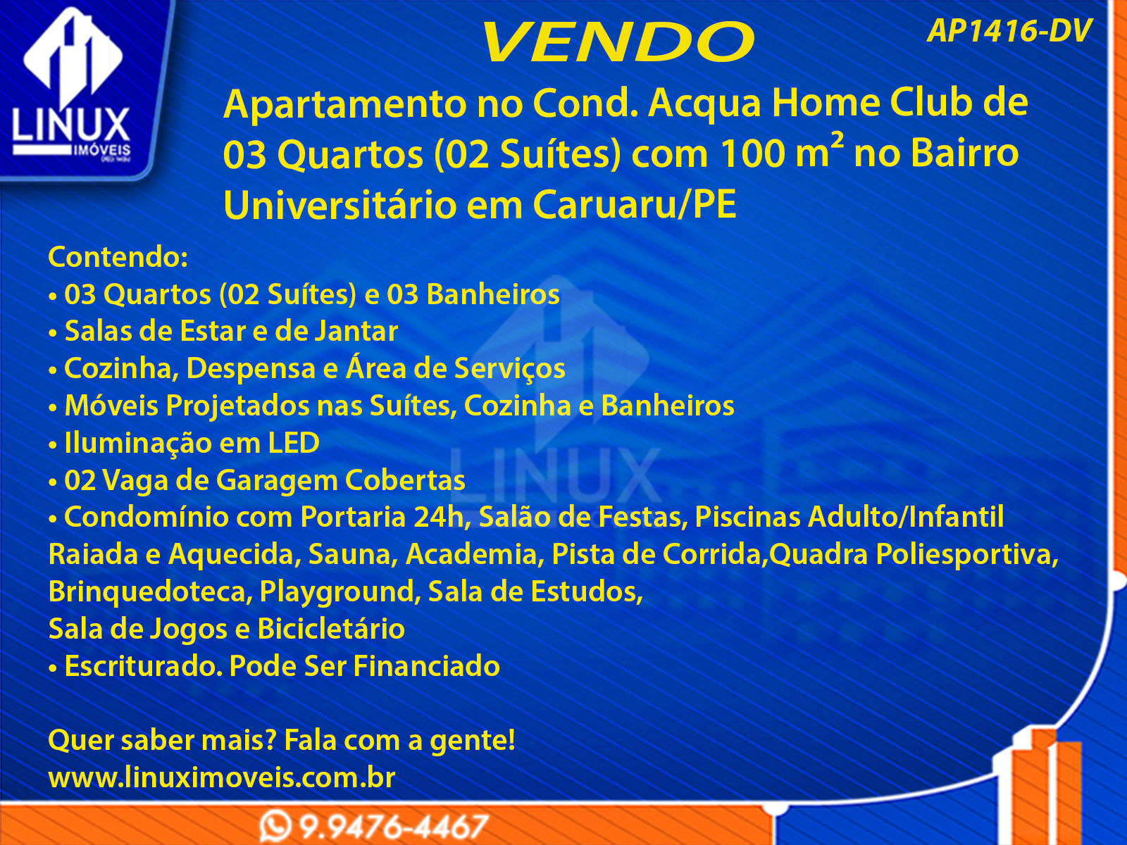 Apartamento no Cond. Acqua Home Club em Caruaru/PE à Venda (AP1416-DV)