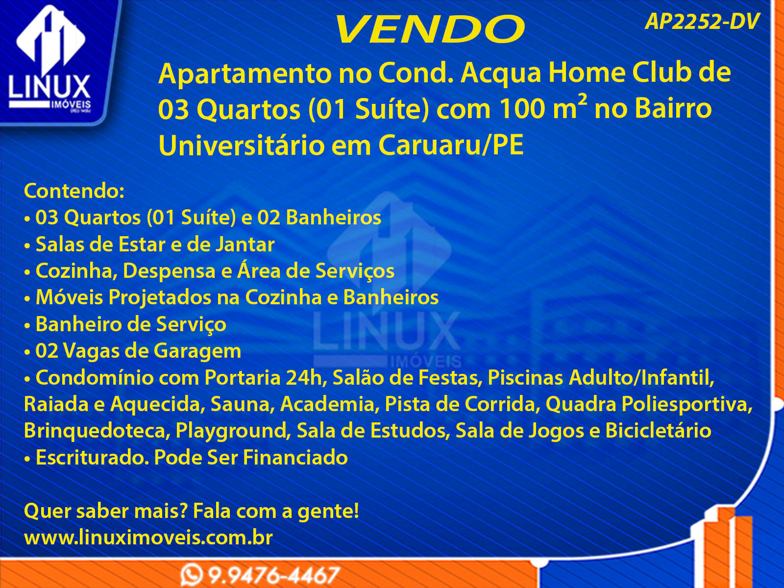 R$660.000,00 / VENDAApartamento no Cond. Acqua Home Club em Caruaru/PE à Venda (AP2252-DV)