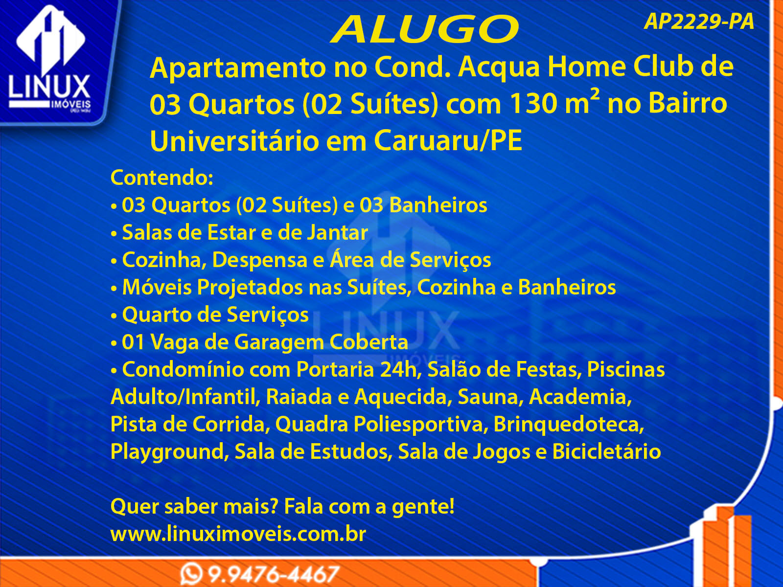 R$4.000,00 / ALUGUELApartamento no Cond. Acqua Home Club em Caruaru/PE p/ Locação (AP2229-PA)
