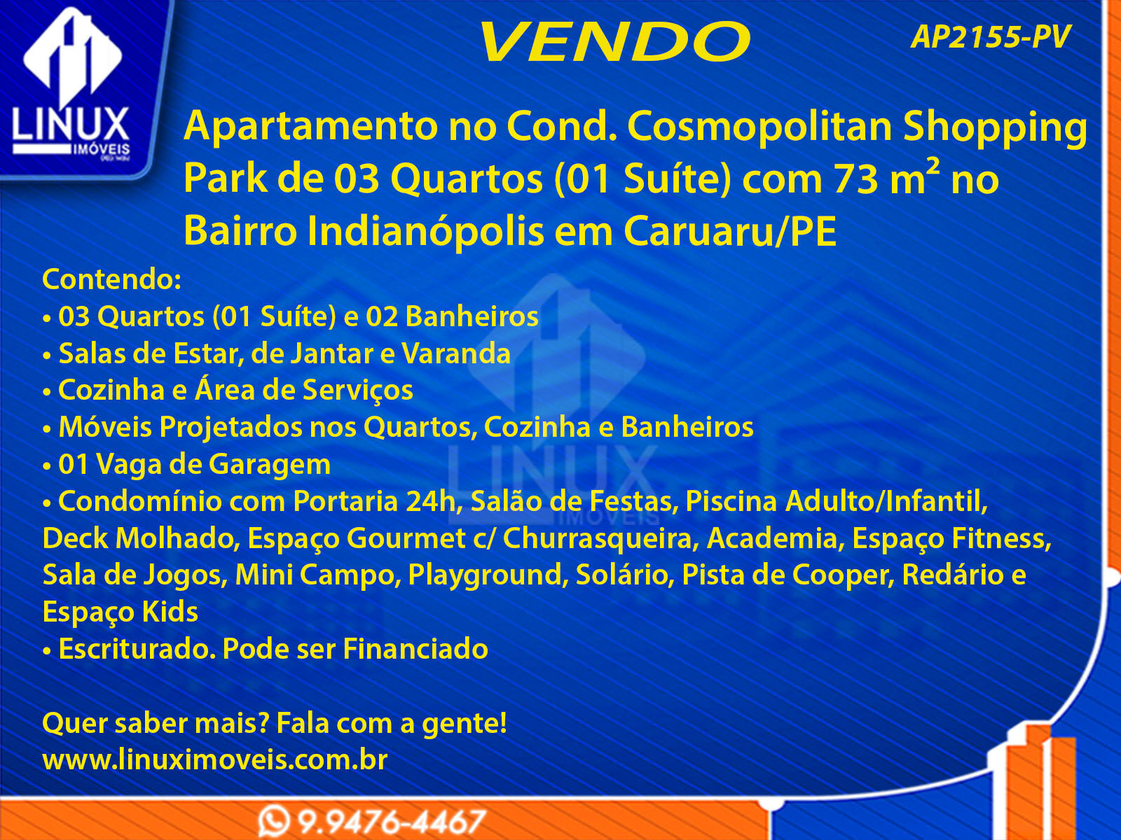 R$669.000,00 / VENDAApartamento no Cond. Cosmopolitan Shopping Park em Caruaru/PE à Venda (AP2155-PV)