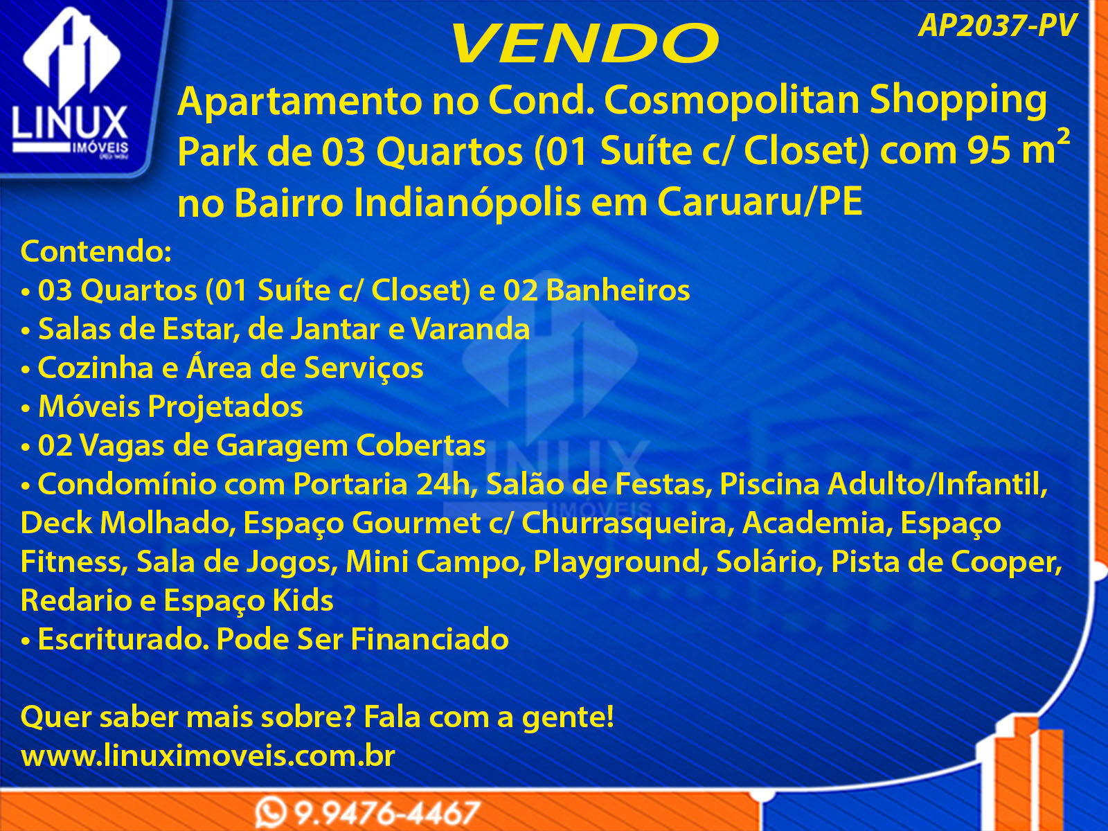 R$950.000,00 / VENDAApartamento no Cond. Cosmopolitan Shopping Park em Caruaru/PE à Venda (AP2037-PV)