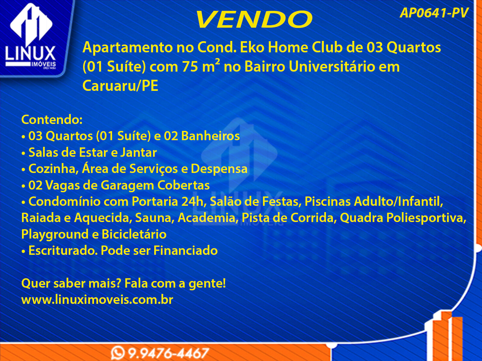 Apartamento no Cond. Eko Home Club de 03 Quartos (01 Suíte) com 75 m² no Bairro Universitário em Caruaru/PE