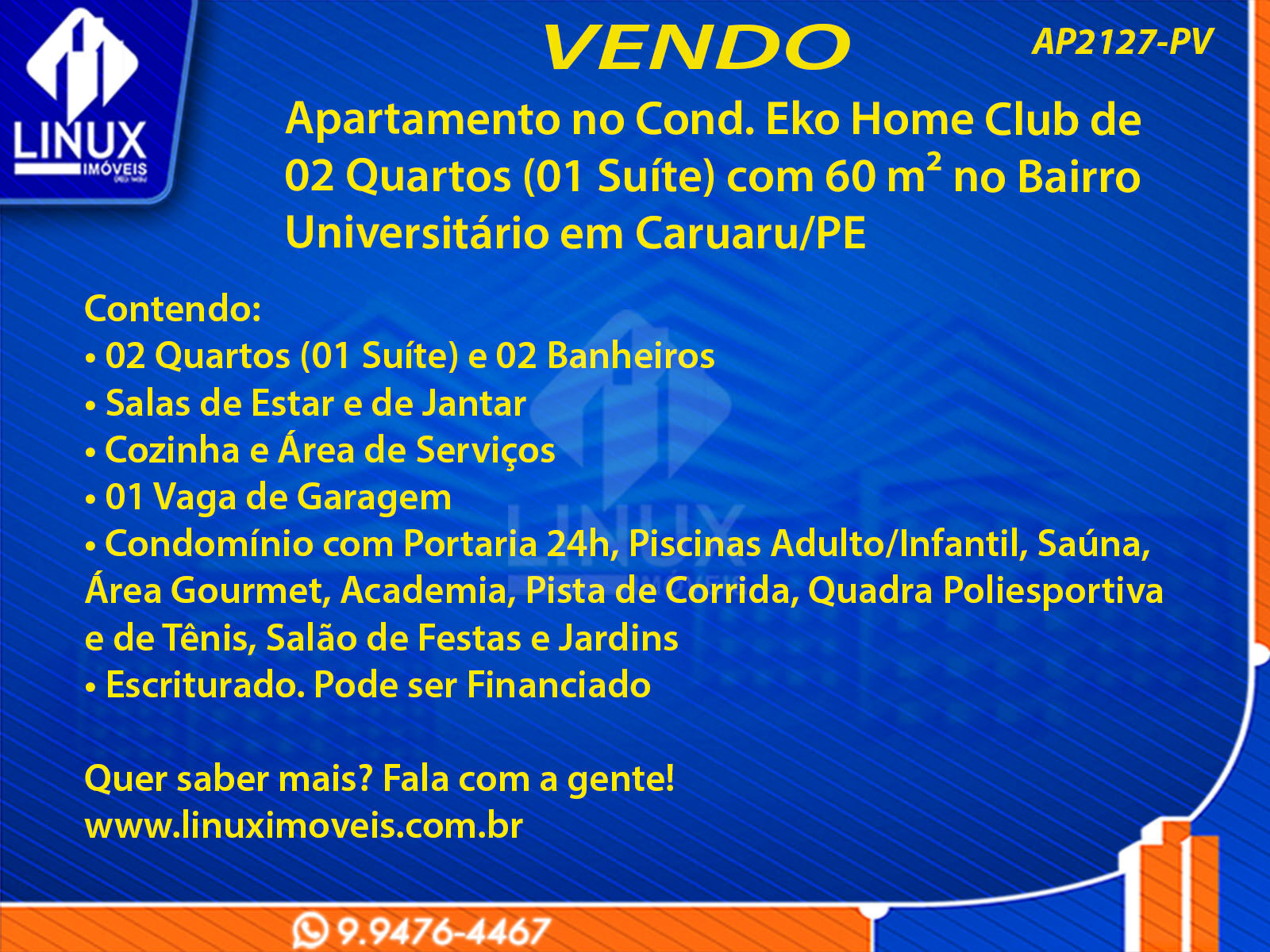 R$345.000,00 / VENDAApartamento no Cond. Eko Home Club em Caruaru/PE à Venda (AP2127-PV)