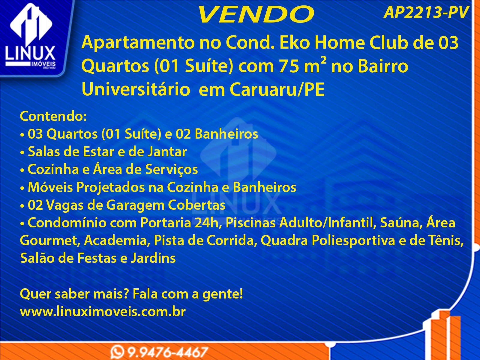 R$540.000,00 / VENDAApartamento no Cond. Eko Home Club em Caruaru/PE à Venda (AP2213-PV)