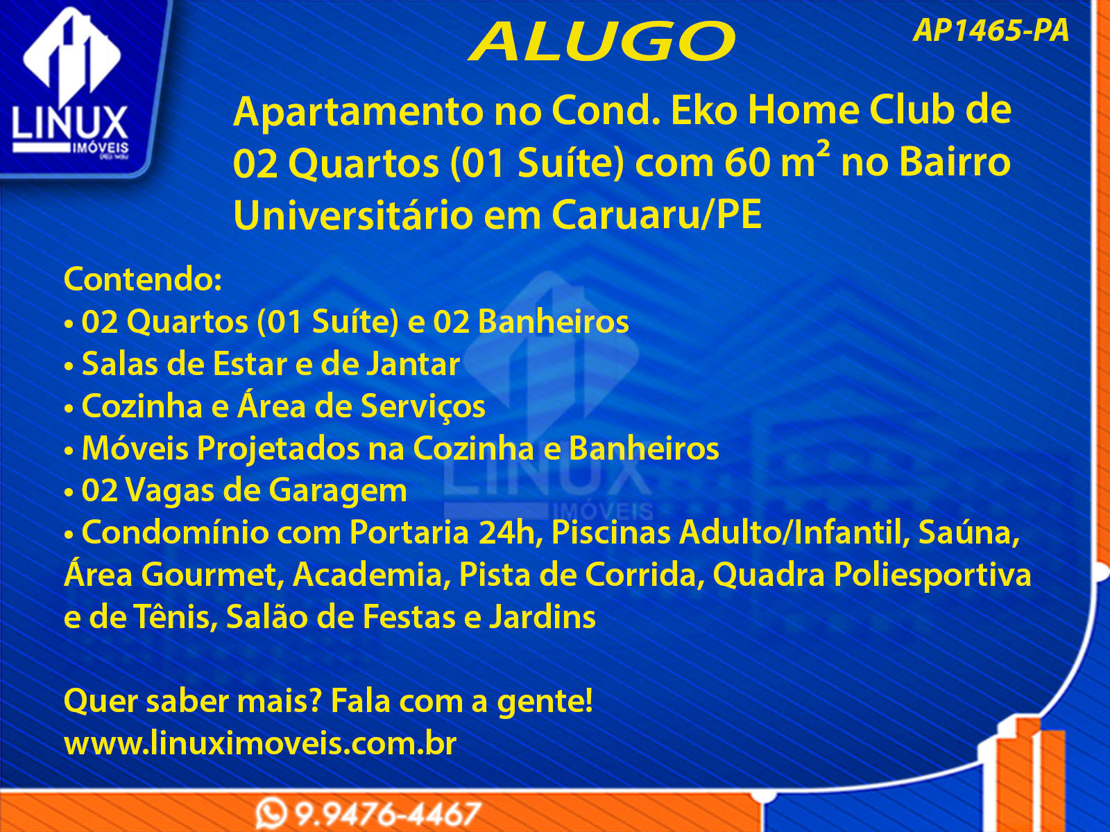 Apartamento no Cond. Eko Home Club em Caruaru/PE p/ Locação (AP1465-PA)
