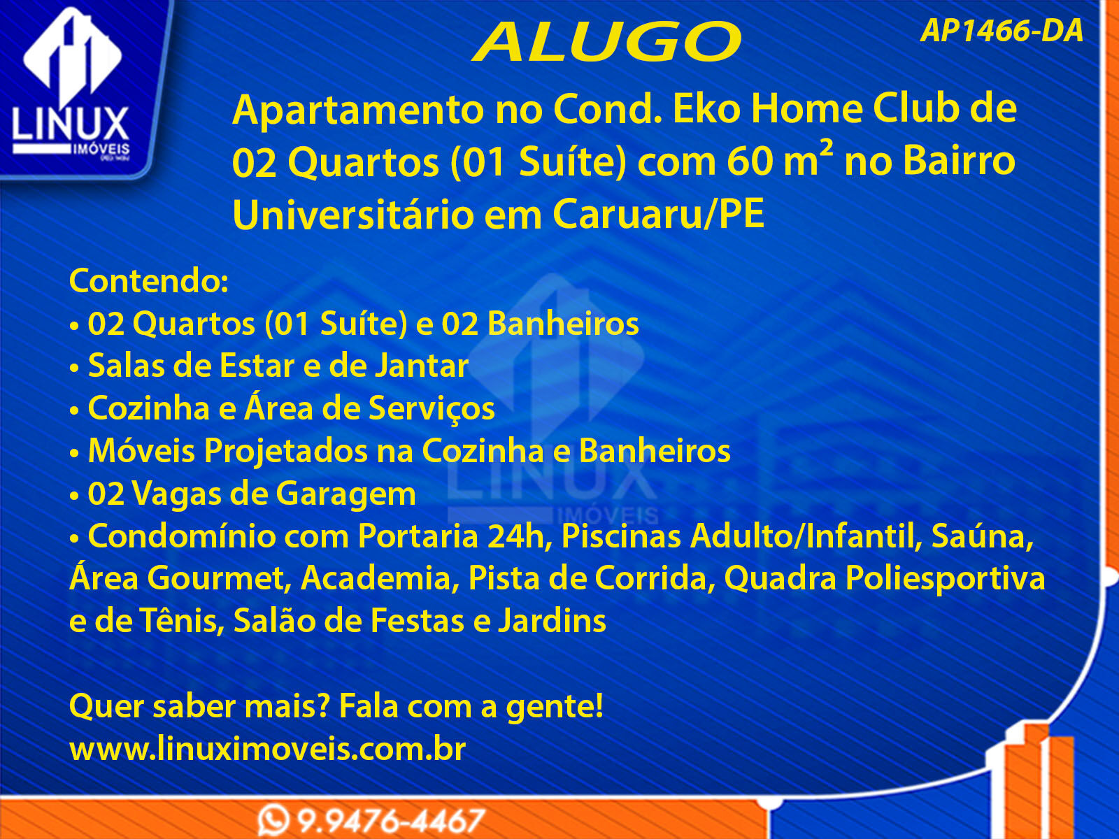 R$2.167,00 / ALUGUELApartamento no Cond. Eko Home Club em Caruaru/PE p/ Locação (AP1466-DA)