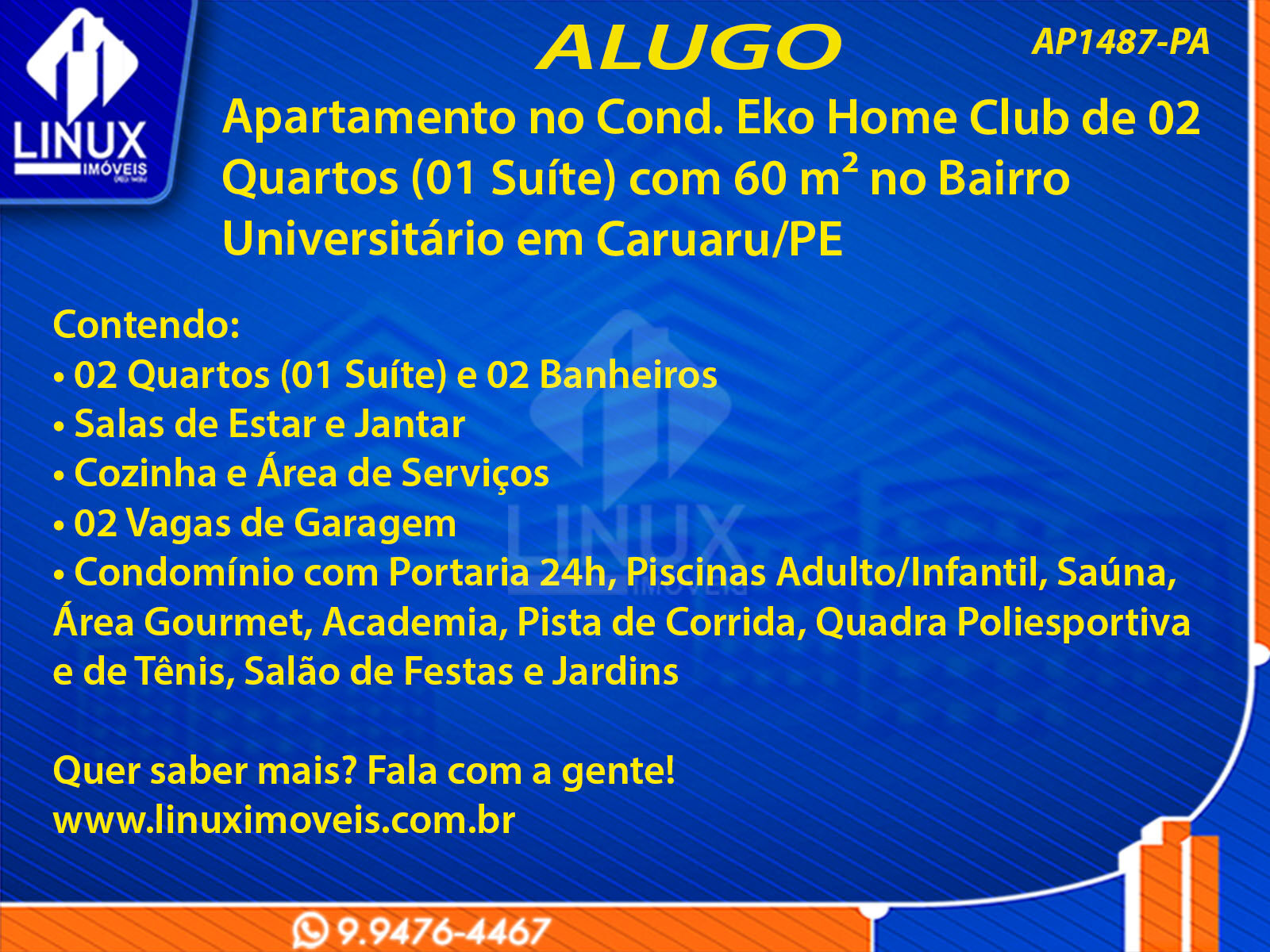 Apartamento no Cond. Eko Home Club em Caruaru/PE p/ Locação (AP1487-PA)