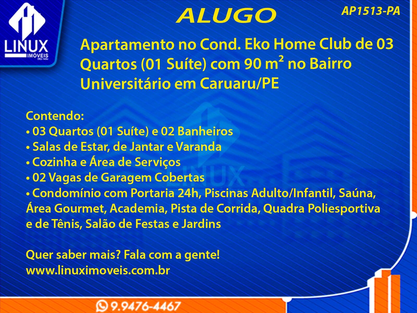 Apartamento no Cond. Eko Home Club em Caruaru/PE p/ Locação (AP1513-PA)