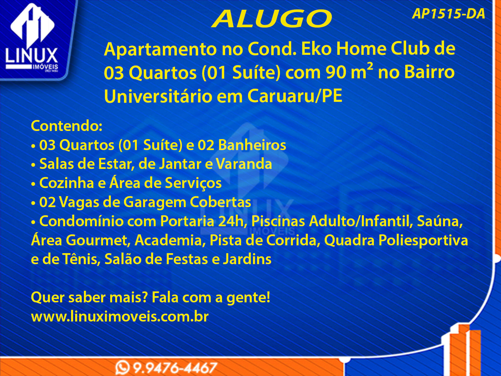 Apartamento no Cond. Eko Home Club em Caruaru/PE p/ Locação (AP1515-DA)