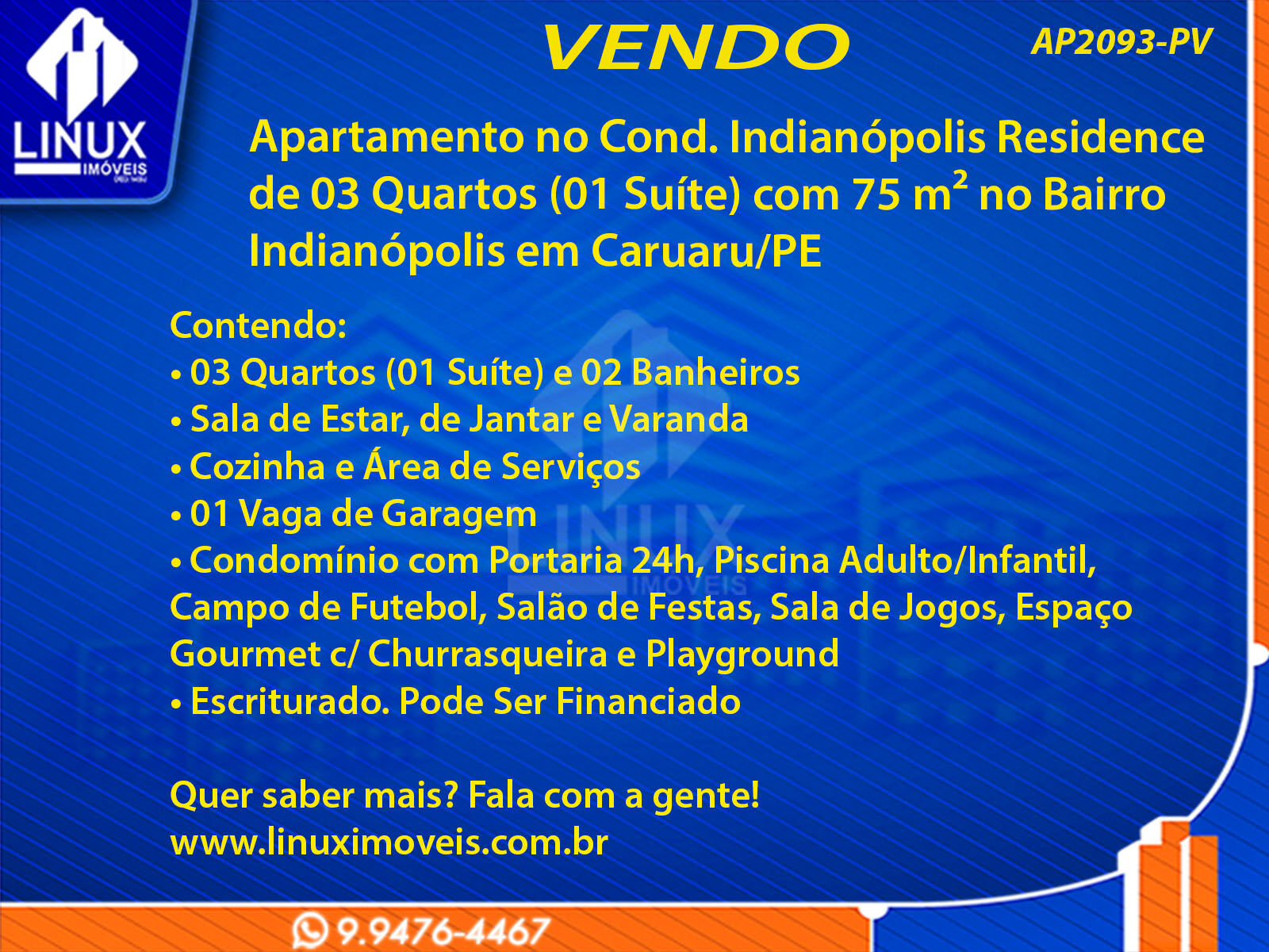 Apartamento no Cond. Indianópolis Residence em Caruaru/PE à Venda (AP2093-PV)