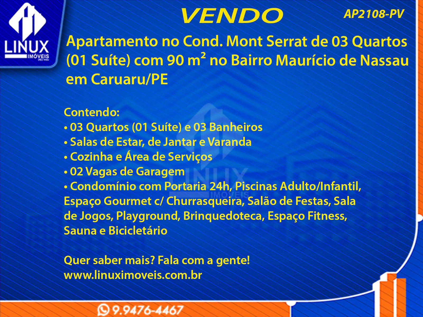 R$540.000,00 / VENDAApartamento no Cond. Mont Serrat em Caruaru/PE à Venda (AP2108-PV)