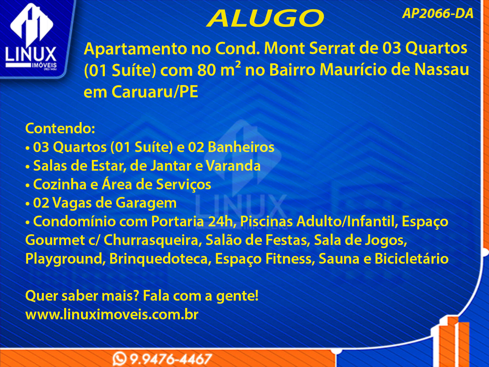 Apartamento no Cond. Mont Serrat em Caruaru/PE p/ Alugar (AP2066-DA)