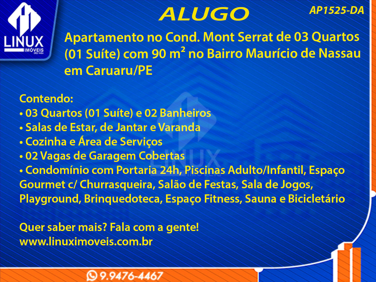 Apartamento no Cond. Mont Serrat em Caruaru/PE p/ Alugar (AP1525-DA)