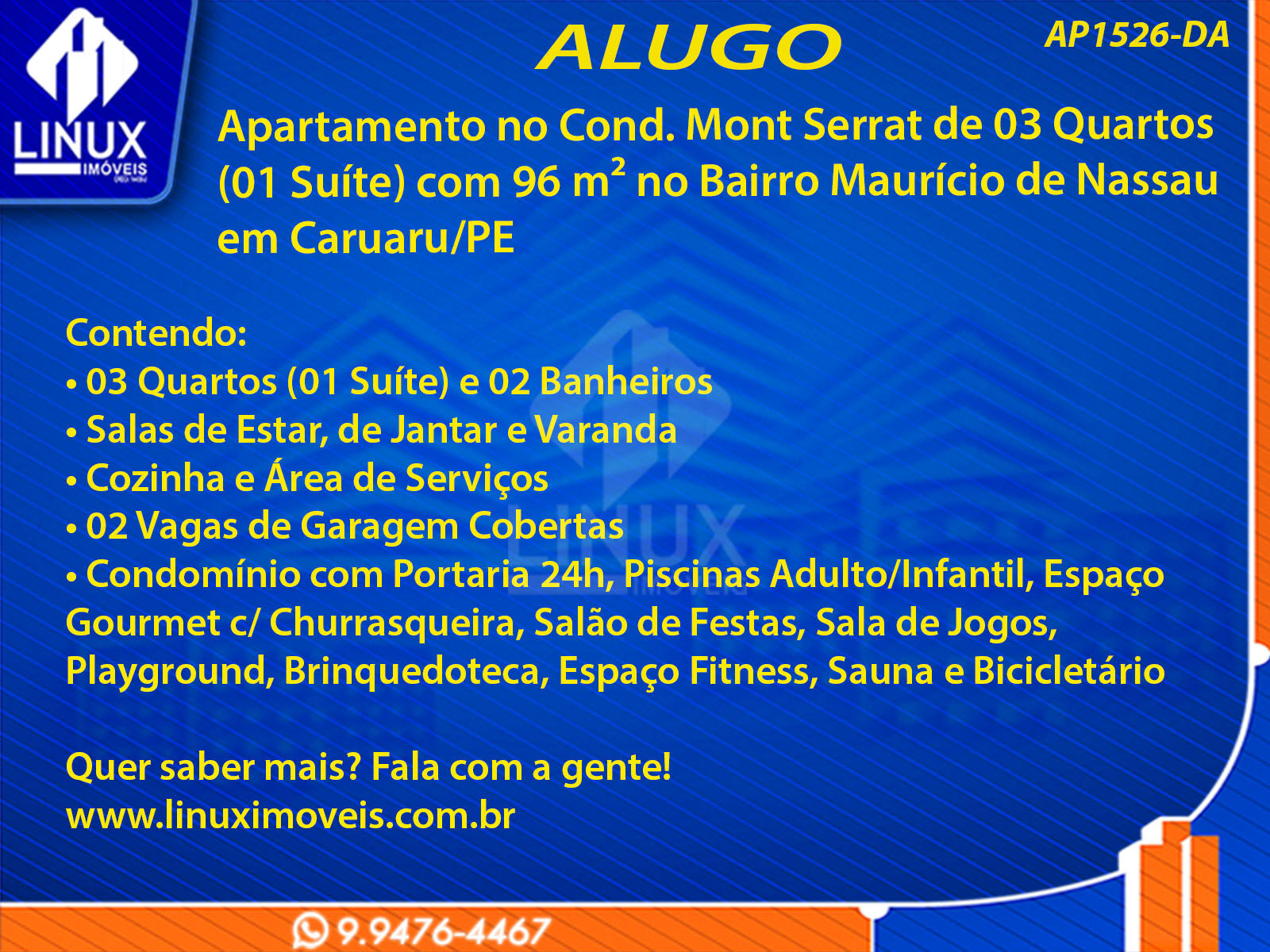 Apartamento no Cond. Mont Serrat em Caruaru/PE p/ Alugar (AP1526-DA)