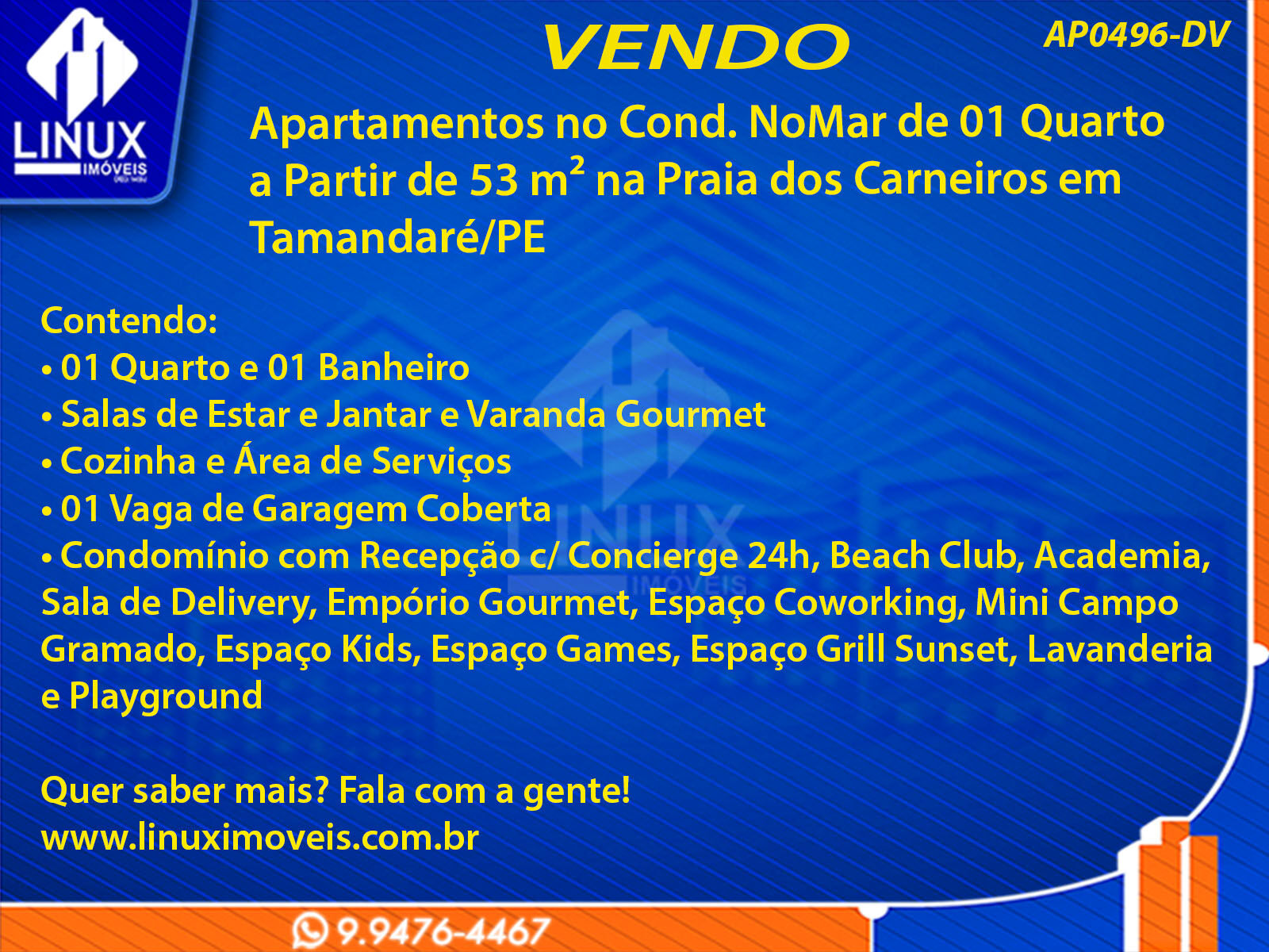 Apartamentos no Cond. NoMar de 01 Quarto a Partir de 53 m² na Praia dos Carneiros em Tamandaré/PE