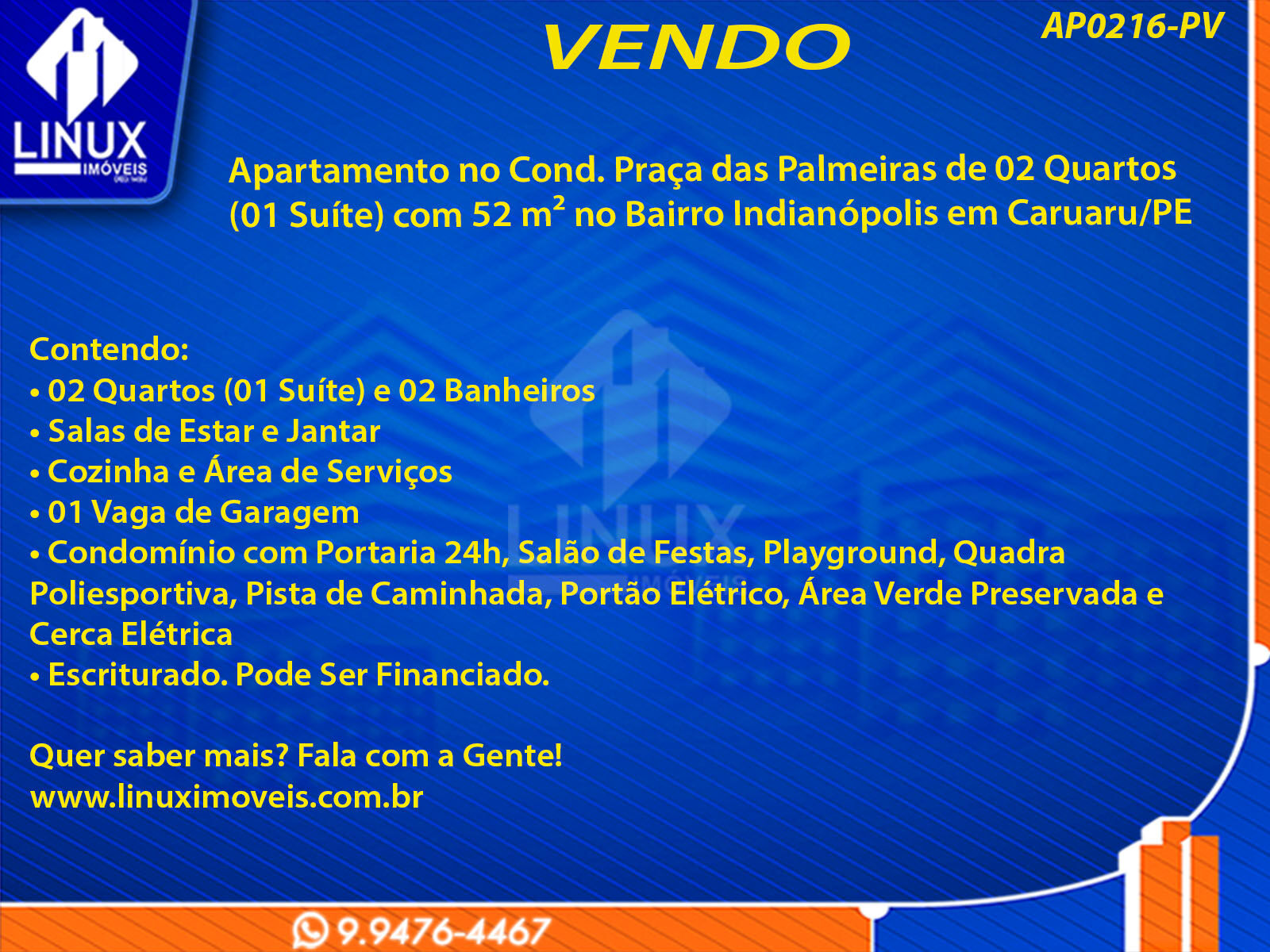 Apartamento no Cond. Praça das Palmeiras de 02 Quartos (01 Suíte) com 52 m² no Bairro Indianópolis em Caruaru/PE