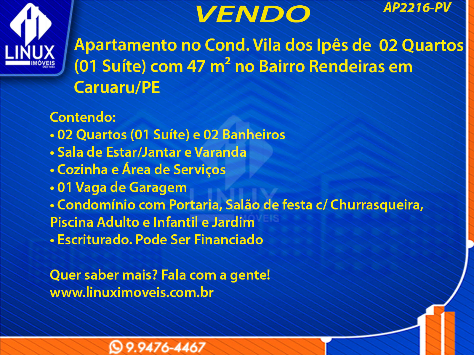 R$230.000,00 / VENDAApartamento no Cond. Vila dos Ipês em Caruaru/PE à Venda (AP2216-PV)