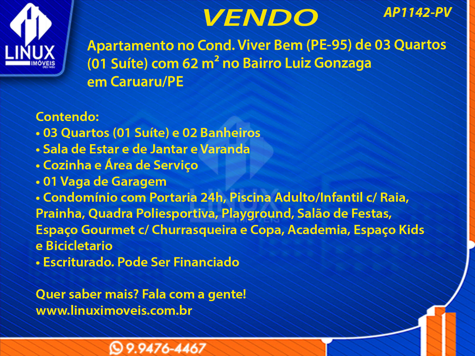 Apartamento no Cond. Viver Bem PE-95 de 03 Quartos (01 Suíte) com 62 m² no Bairro Luiz Gonzaga em Caruaru/PE
