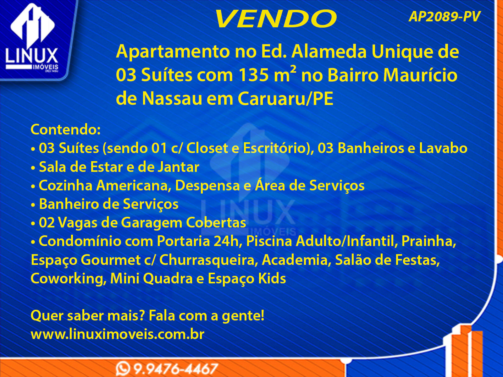 R$1.200.000,00 / VENDAApartamento no Ed. Alameda Unique em Caruaru à Venda (AP2089-PV)