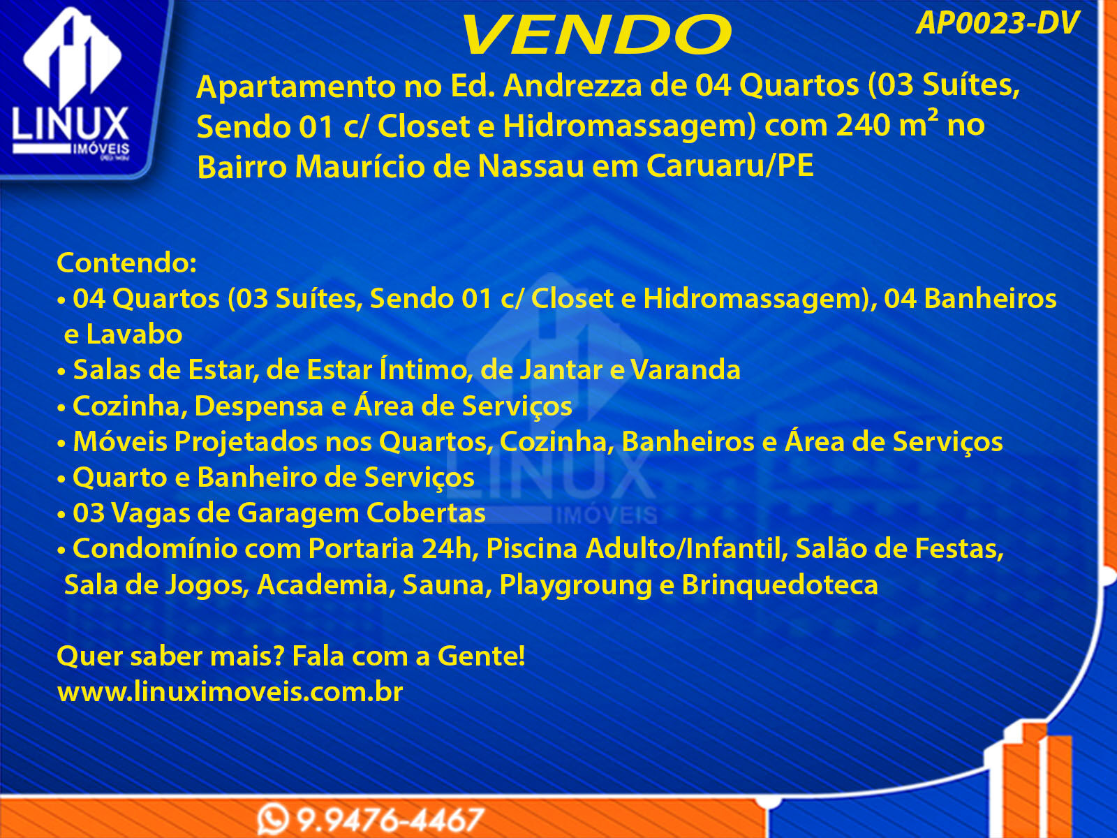 Apartamento no Ed. Andrezza de 04 Quartos (03 Suítes, Sendo 01 c/ Closet e Hidromassagem) com 240 m² no Bairro Maurício de Nassau em Caruaru/PE