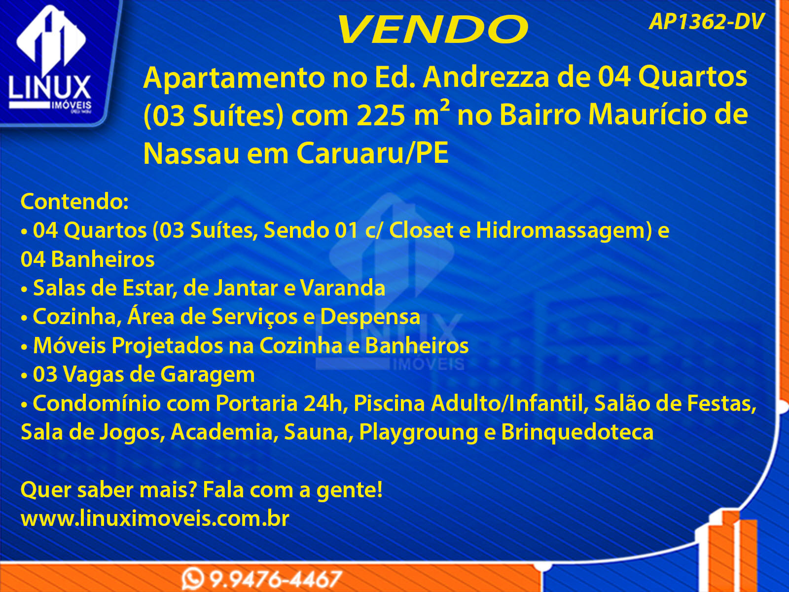 Apartamento no Ed. Andrezza de 04 Quartos (03 Suítes, Sendo 01 c/ Closet e Hidromassagem) com 225 m² no Bairro Maurício de Nassau em Caruaru/PE