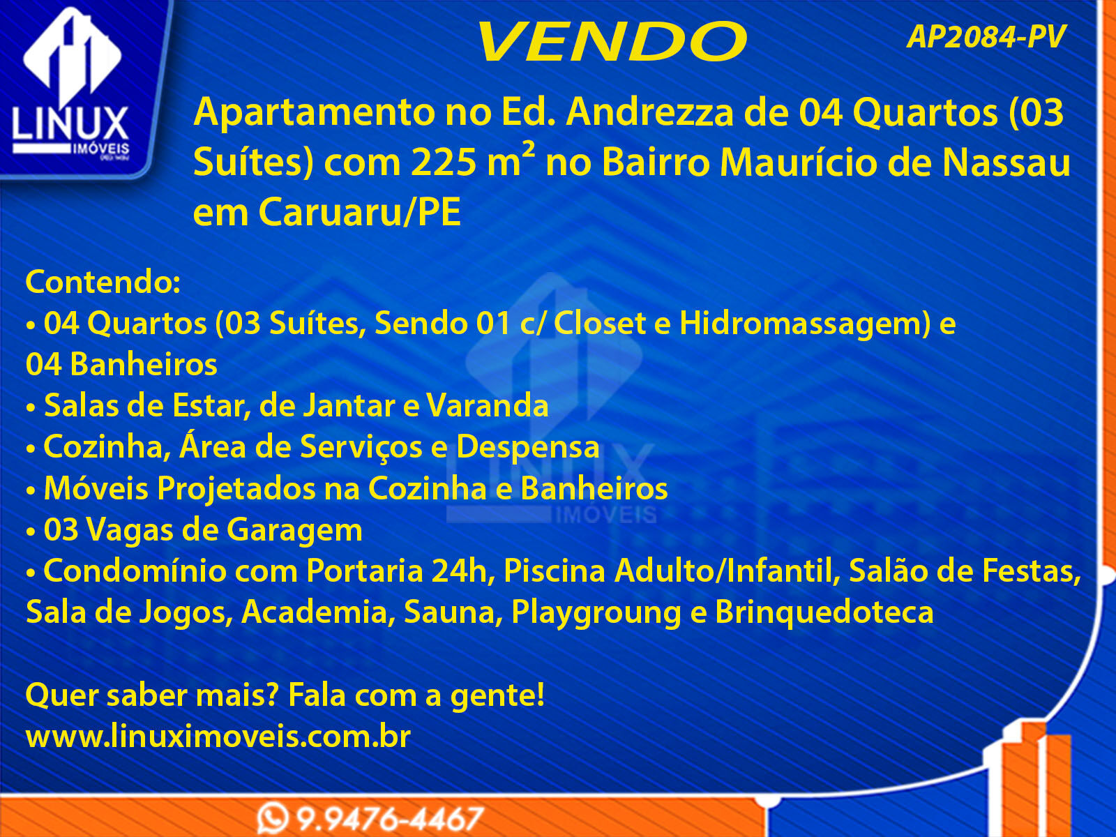 Apartamento no Ed. Andrezza de 04 Quartos (03 Suítes, Sendo 01 c/ Closet e Hidromassagem) com 225 m² no Bairro Maurício de Nassau em Caruaru/PE