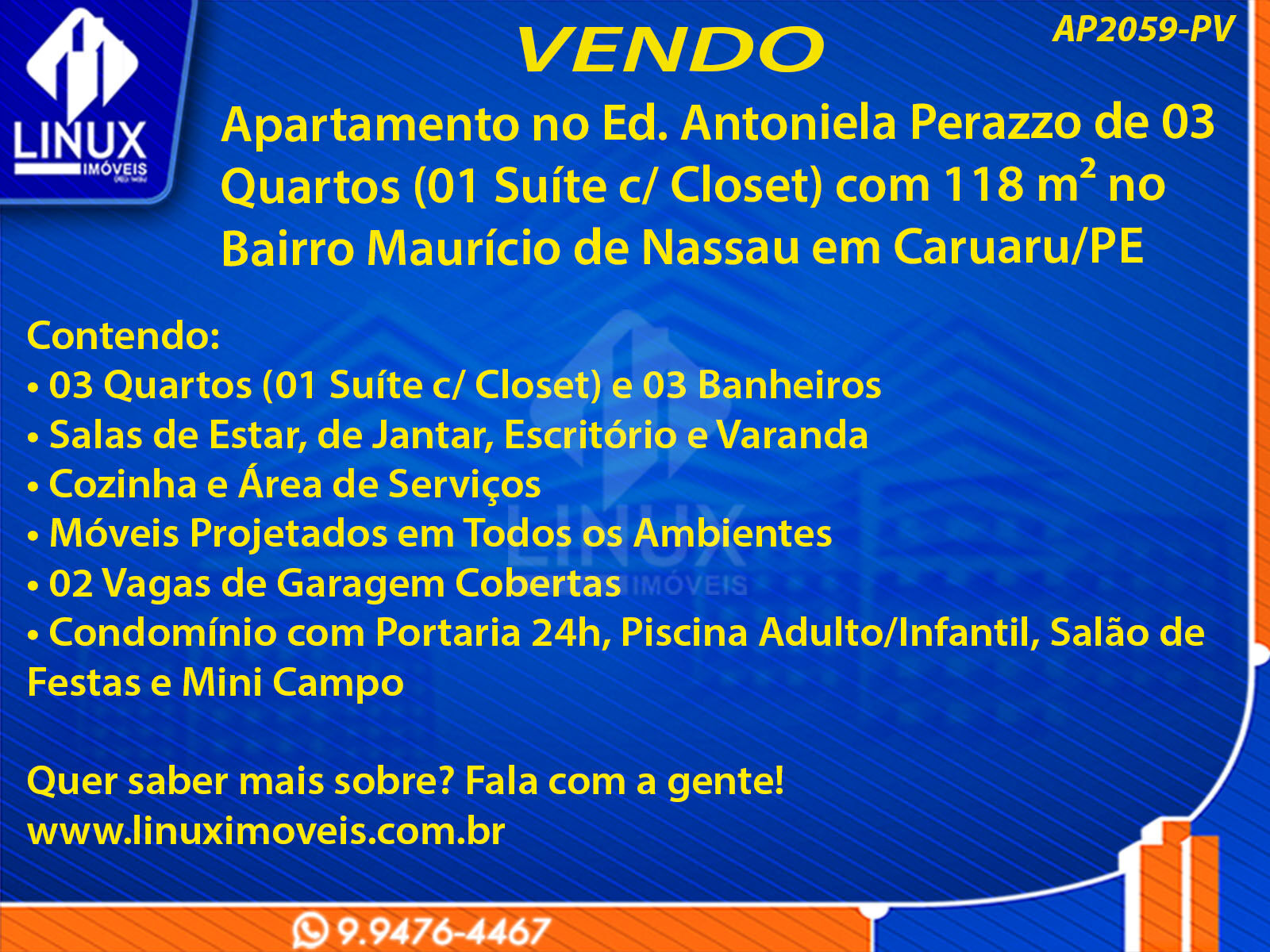 Apartamento no Ed. Antoniela Perazzo de 03 Quartos (01 Suíte c/ Closet) com 118 m² no Bairro Maurício de Nassau em Caruaru/PE