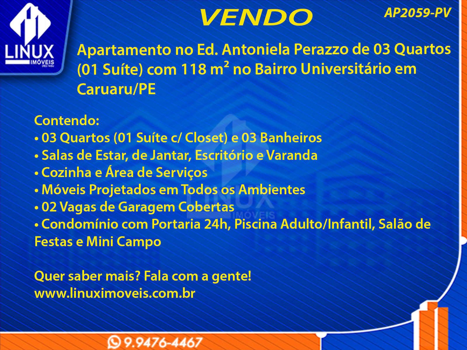 Apartamento no Ed. Antoniela Perazzo de 03 Quartos (01 Suíte c/ Closet) com 118 m² no Bairro Universitário em Caruaru/PE