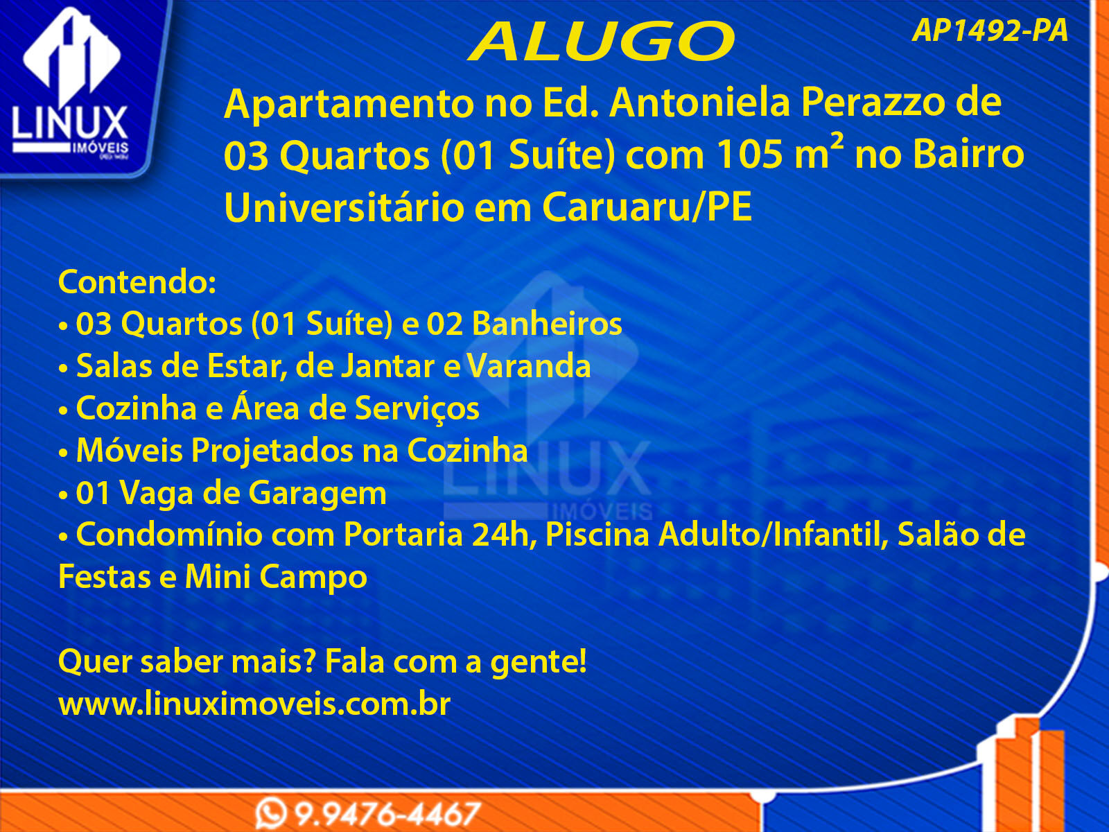 R$1.676,00 / ALUGUELApartamento no Ed. Antoniela Perazzo em Caruaru/PE p/ Locação (AP1492-PA)