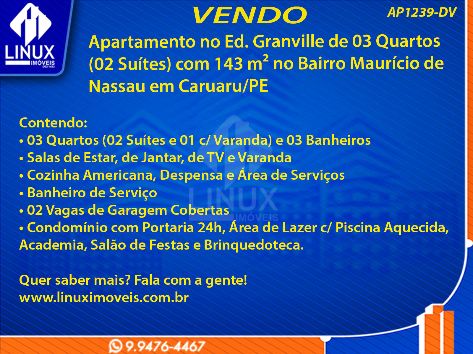 Apartamento no Ed. Granville de 03 Quartos (02 Suítes) com 143 m² no Bairro Maurício de Nassau em Caruaru/PE