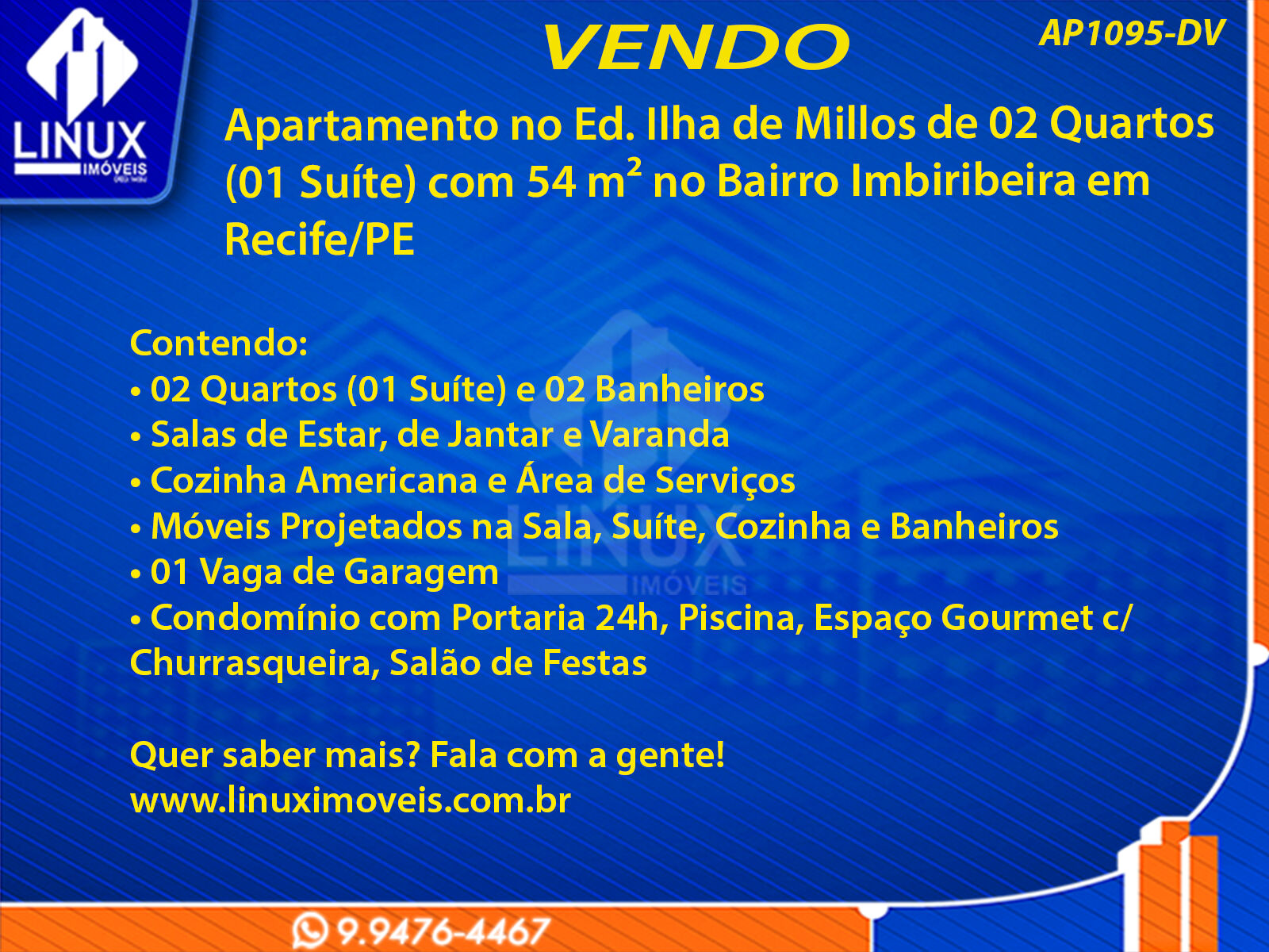 Apartamento no Ed. Ilha de Millos de 02 Quartos (01 Suíte) com 54 m² no Bairro Imbiribeira em Recife/PE