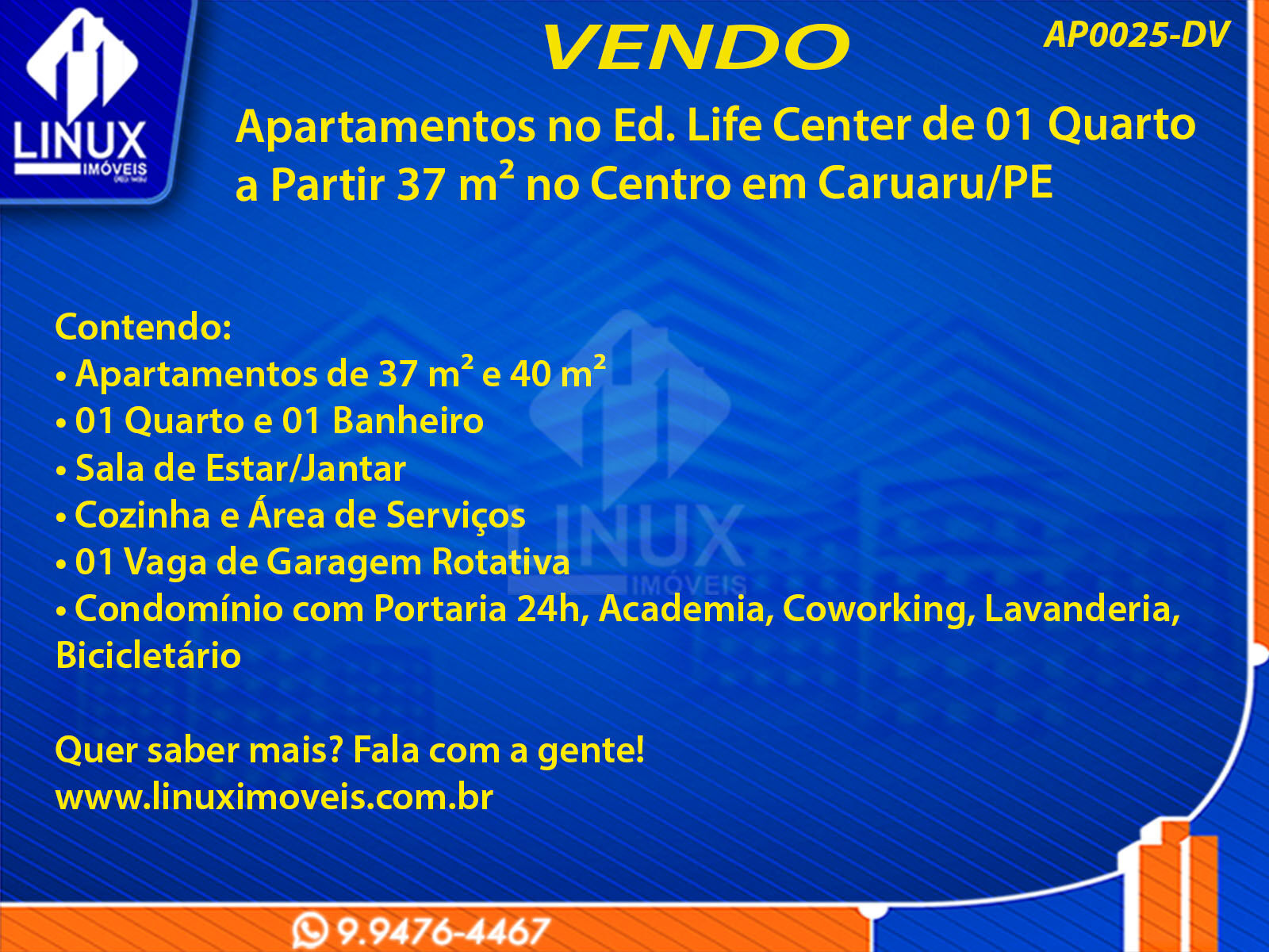 Apartamentos no Ed. Life Center de 01 Quarto a Partir 37 m² no Centro em Caruaru/PE