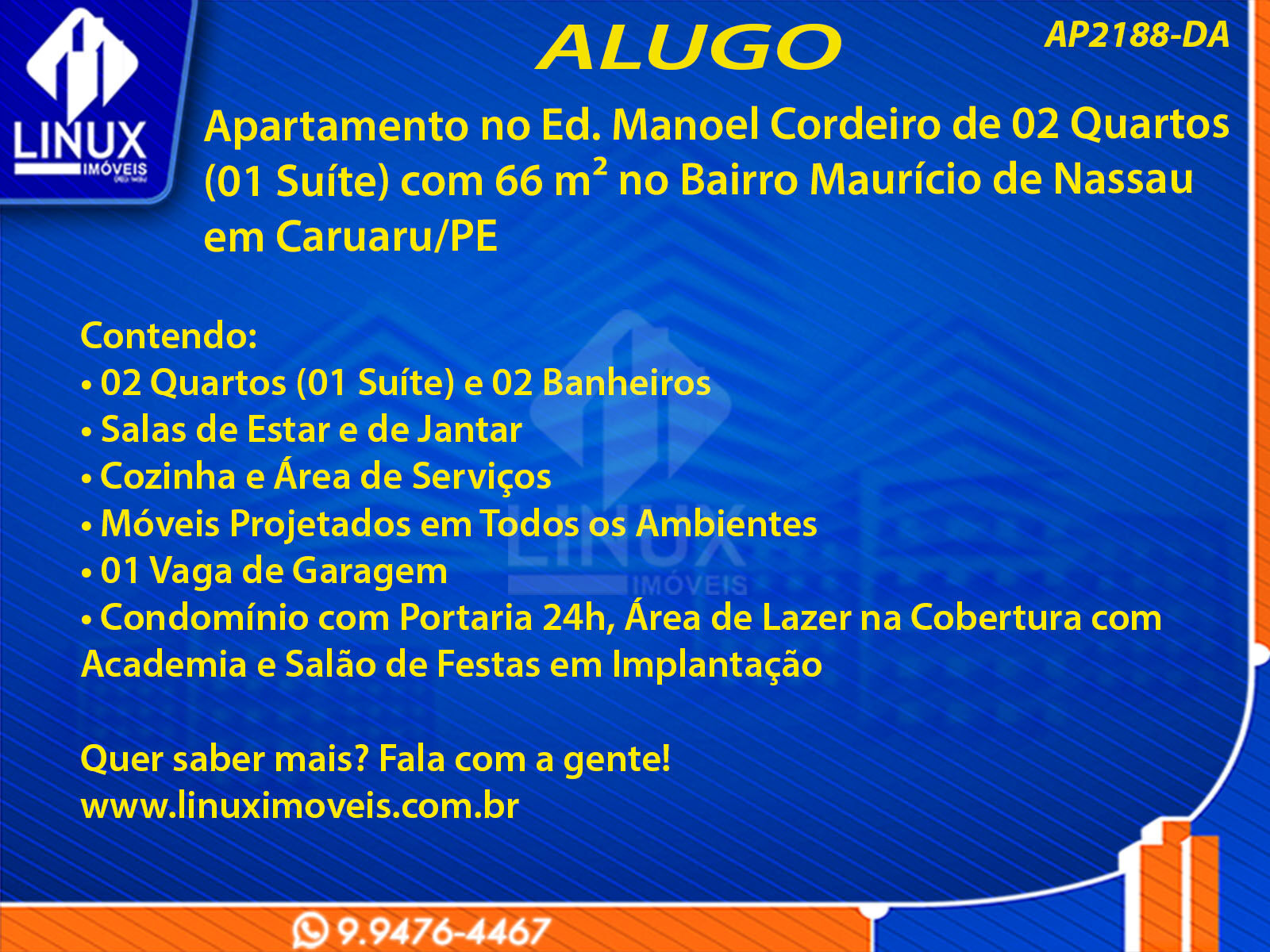 R$2.500,00 / ALUGUELApartamento no Ed. Manoel Cordeiro em Caruaru/PE P/ Locação (AP2188-DA)